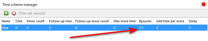 Bản này có cách set time theo cơ chế khác nên muốn set time mỗi nước thì anh em ghi vào chỗ Byoyomi như hình nhé(mấy ô khác điền 0 hết):